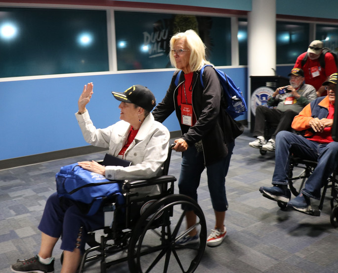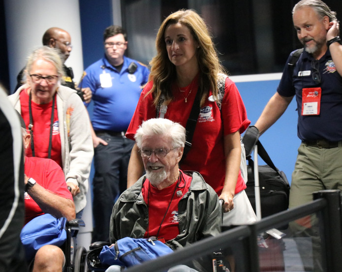 The fledgling First Coast Honor Flight made just their third Honor Flight from Jacksonville on Saturday, September 16. The flight consisted of twenty-two honored war veterans, 4 from the Korean War and 18 from Vietnam. The men and women who were honored were treated to a unique and full day. At 3:15 am, the procession of veterans, guardians, and Honor Flight staff proceeded to board busses at the Evangel Temple Assembly of God in Jacksonville for the 25-minute bus ride to Jacksonville International Airport where their day would begin and end.